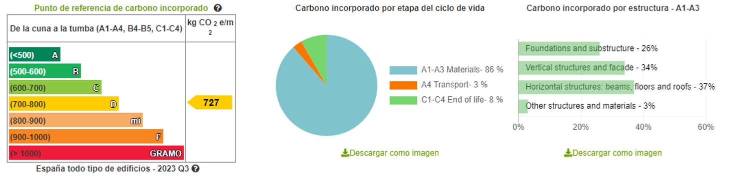 Empleando la herramienta One Click, se pueden visualizar y descargar gráficas con porcentajes del carbono embebido de los materiales de acuerdo a su clasificación y a la etapa del ciclo a la que pertenecen, por ejemplo: cimentaciones, estructuras y fachadas, vigas, forjados y cubiertas.
