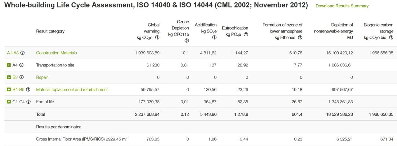 En las edificaciones, la mayor parte de los impactos medioambientales provienen de la etapa de producto (A1-A3), es decir del carbono embebido de los materiales de construcción. La cantidad de estos impactos es declarada en un documento estandarizado denominado Declaración Ambiental de Producto (DAP), este incluye los resultados del análisis de ciclo de vida de un producto.