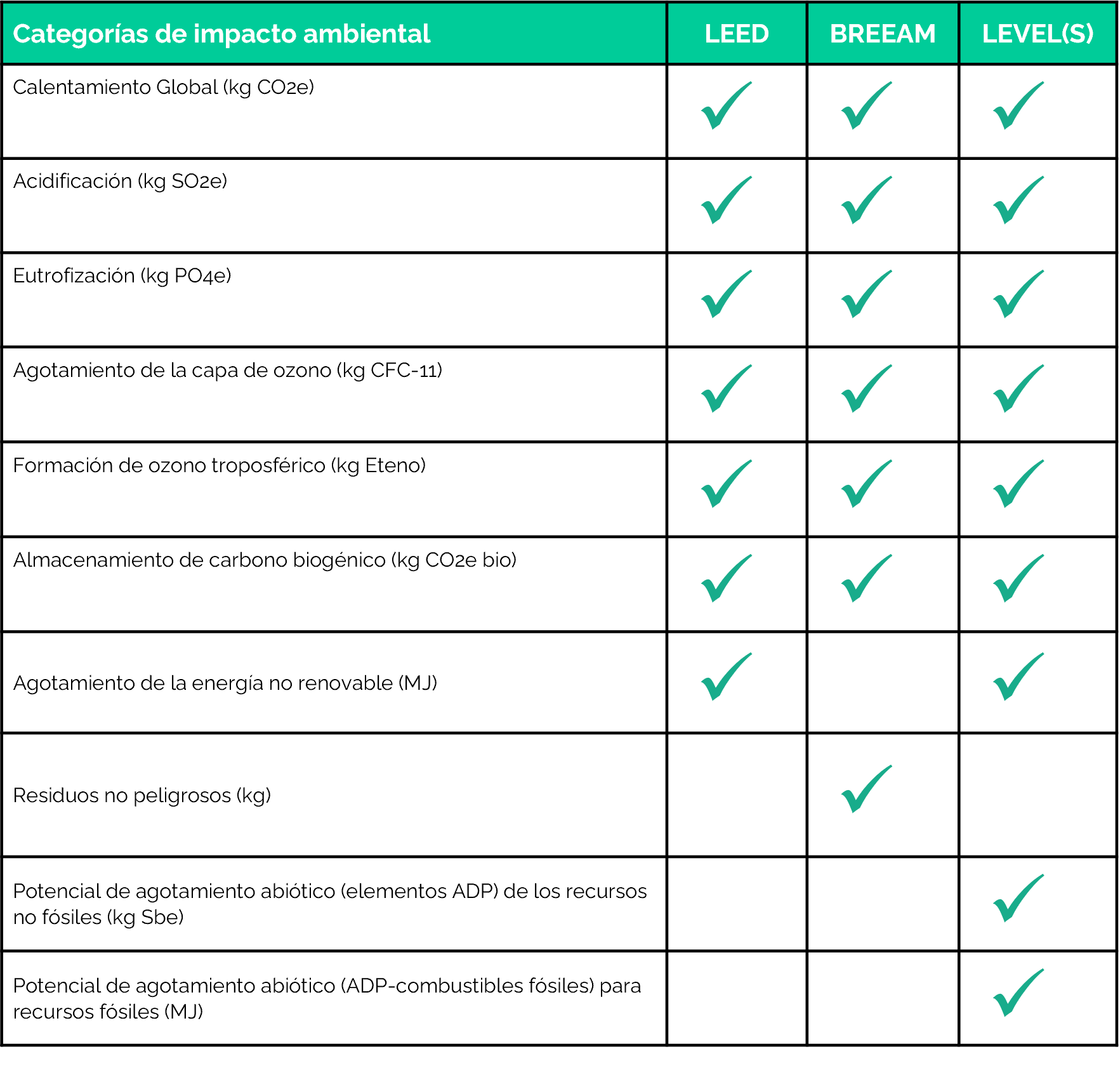 Si analizamos las categorías de impacto ambiental que evalúan están dos certificaciones: LEED y BREEAM, observamos que el marco Level(s) abarca más categorías en comparación con las certificaciones LEED y BREEAM, incluyendo el potencial de agotamiento abiótico tanto de los recursos fósiles como no fósiles.